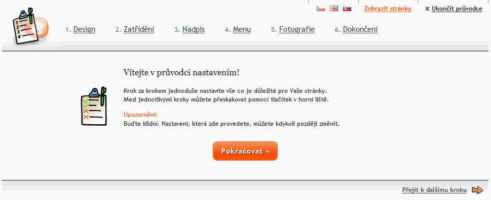 Úplně nahoře si můžete změnit jazyk průvodce. Také tam je Zobrazit stránky a Ukončit průvodce. Pod tím tam máte odkazy na jednotlivé kroky průvodce. Aspoň se nemusíme proklikávat pokračováním. Klikl jsem na Pokračovat a jsme v nastavení designu. Zde je nahoře proužek se šablonami. Tu, kterou si vyberete, tak se ukáže dole v náhledu 1:1. Hned vedle toho si vyberete i logo (V nové verzi nazváno Obrázek v záhlaví). I to uvidíte v náhledu. Tak dám zase Pokračovat a jsem ve Zatřídění. To je úplně stejné, jako v současné verzi Nadpis stránek. Po dalším pokračování se objeví Nadpis. Můžete si změnit barvu nadpisu a zarovnání. Můžete také zaškrtnout nezobrazovat. Dálší je Menu. U něj nově můžete zaškrtnout submenu a vybrat rozbalovací nebo rozklikávací menu. To se mi zatím ještě nepovedlo zprovoznit. Po dalším pokračování si můžete nahrát fotogalerie a nakonec jsou doporučení a odkaz do administrace. Průvodce je opravdu dobře udělaný.
